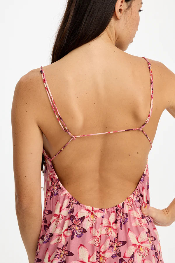 Our casual and slouchy open back romper with a simple fixed string detail and adjustable straps. The perfect beach throw over for when you run to the store to re-stock on snacks.