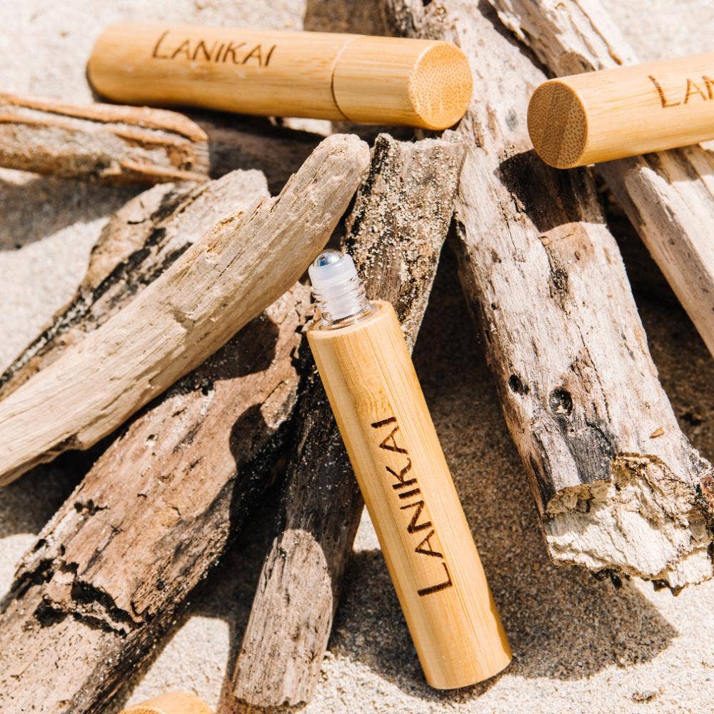 10 ml each in Lanikai bamboo container with roll on applicator, in plastic case.