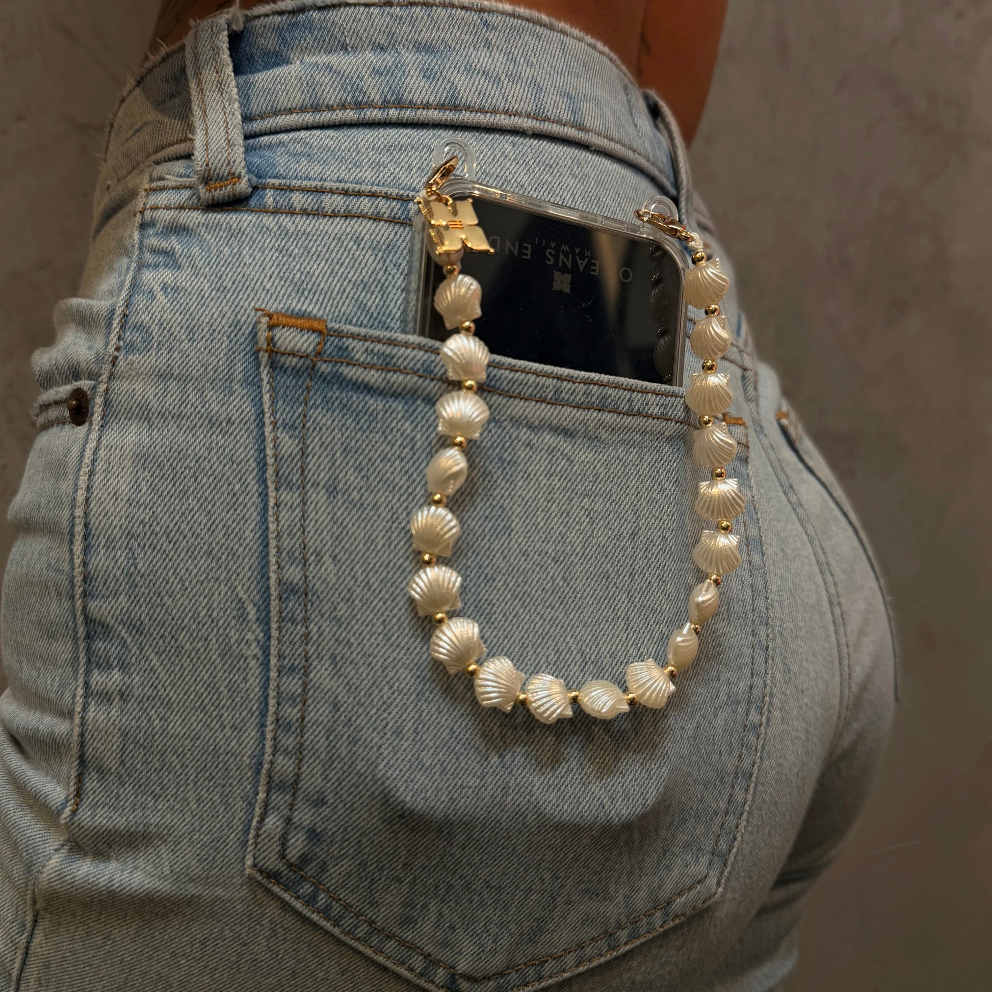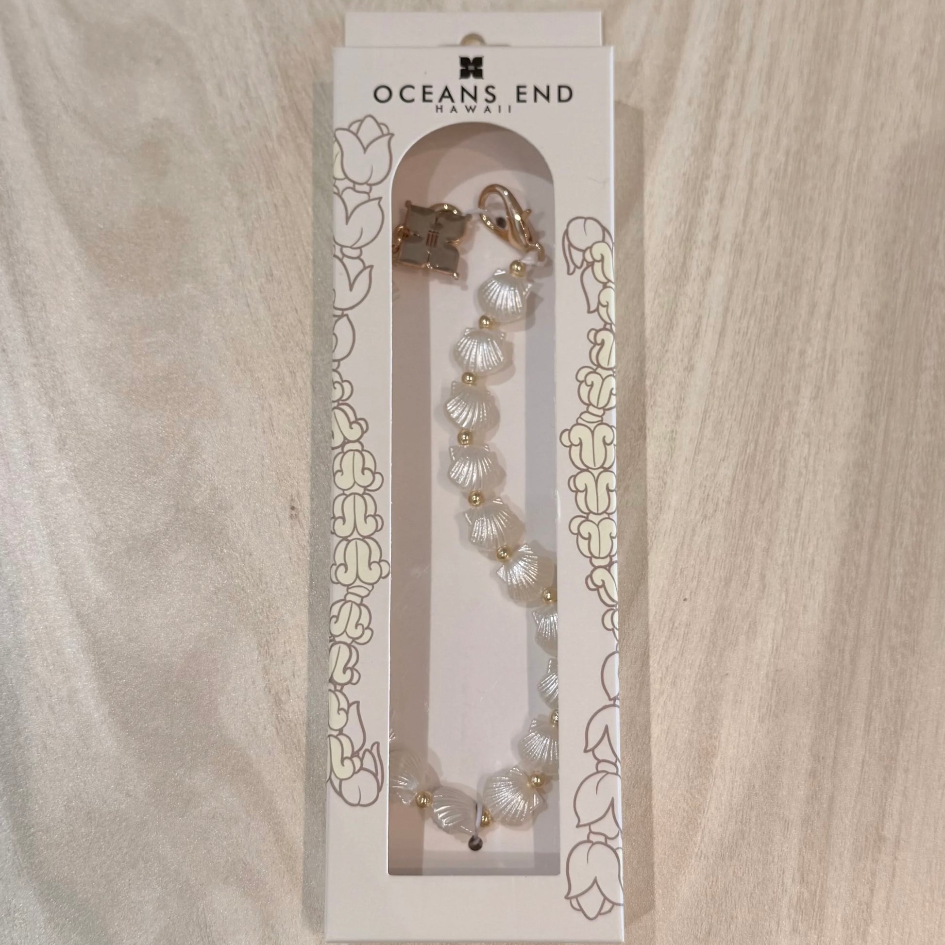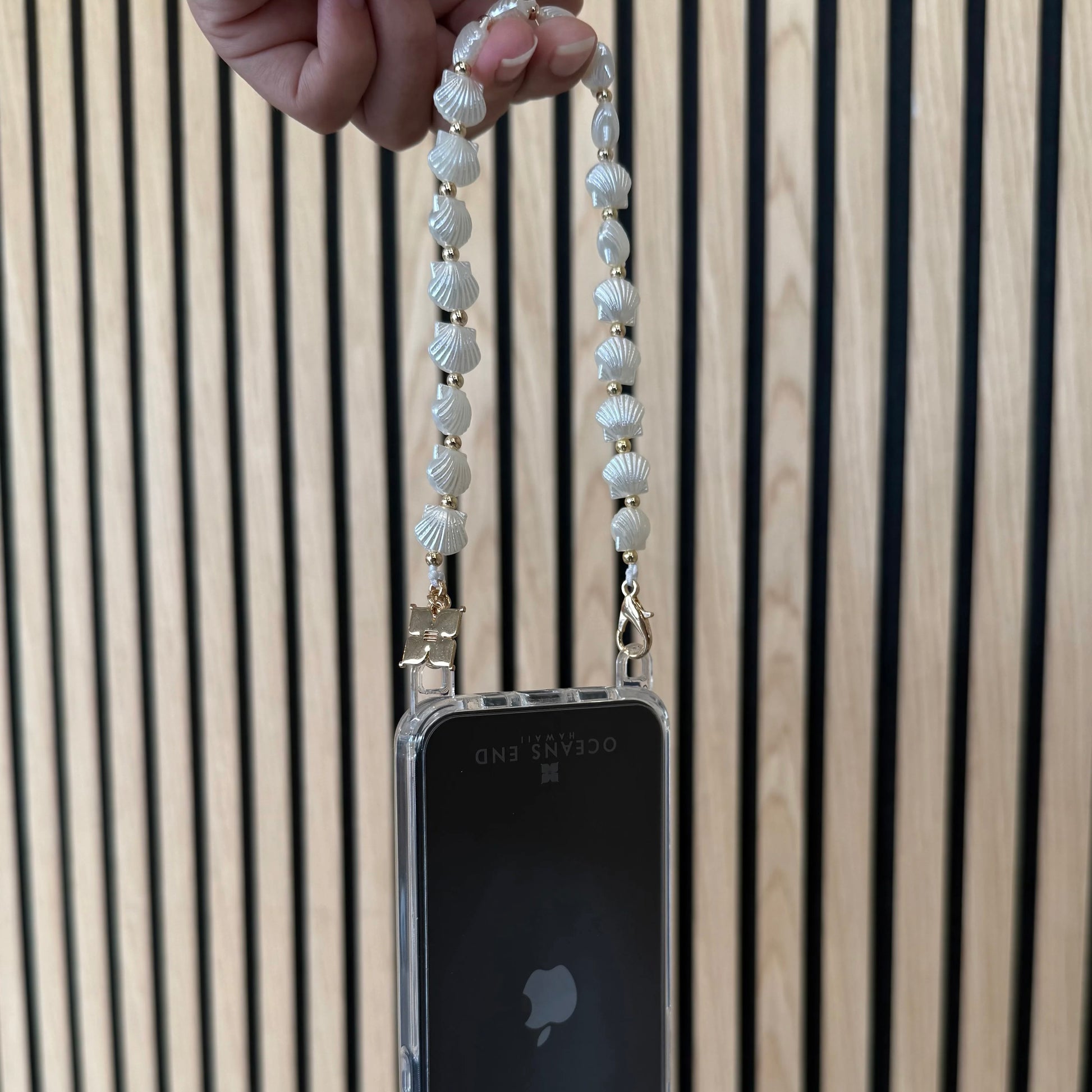 Our shell adornment features a strand of White Sea shells accented with small gold beads and our signature gold Oceans end designer logo charm. Finished with gold claps on both ends to easily pair with our new phone case for an elevated look.